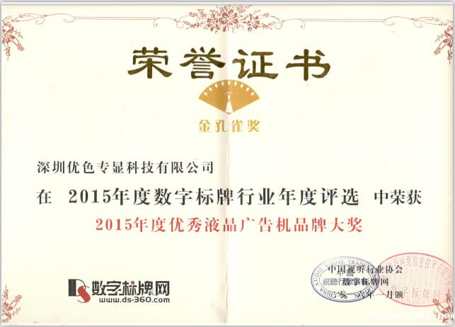 华体汇官网首页进入荣获 “2015年度优秀液晶广告机品牌大奖”